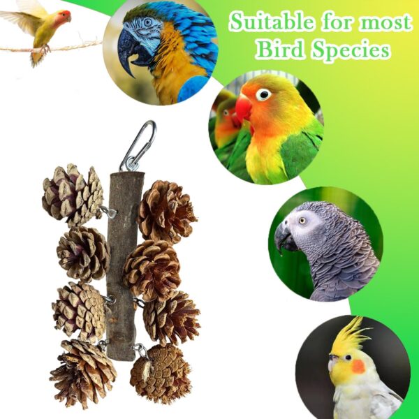 【Safe Material】: This set of hanging bird toys is made of natural wood, pine cones, with no paint, handmade, safe and harmless for parrots. Your pet bird can enjoy playing with it without any worries. Some pine cones have white crystals on them. These are pine cone crystals and can be removed by wiping.