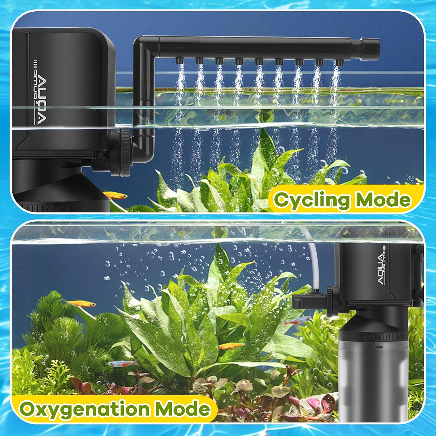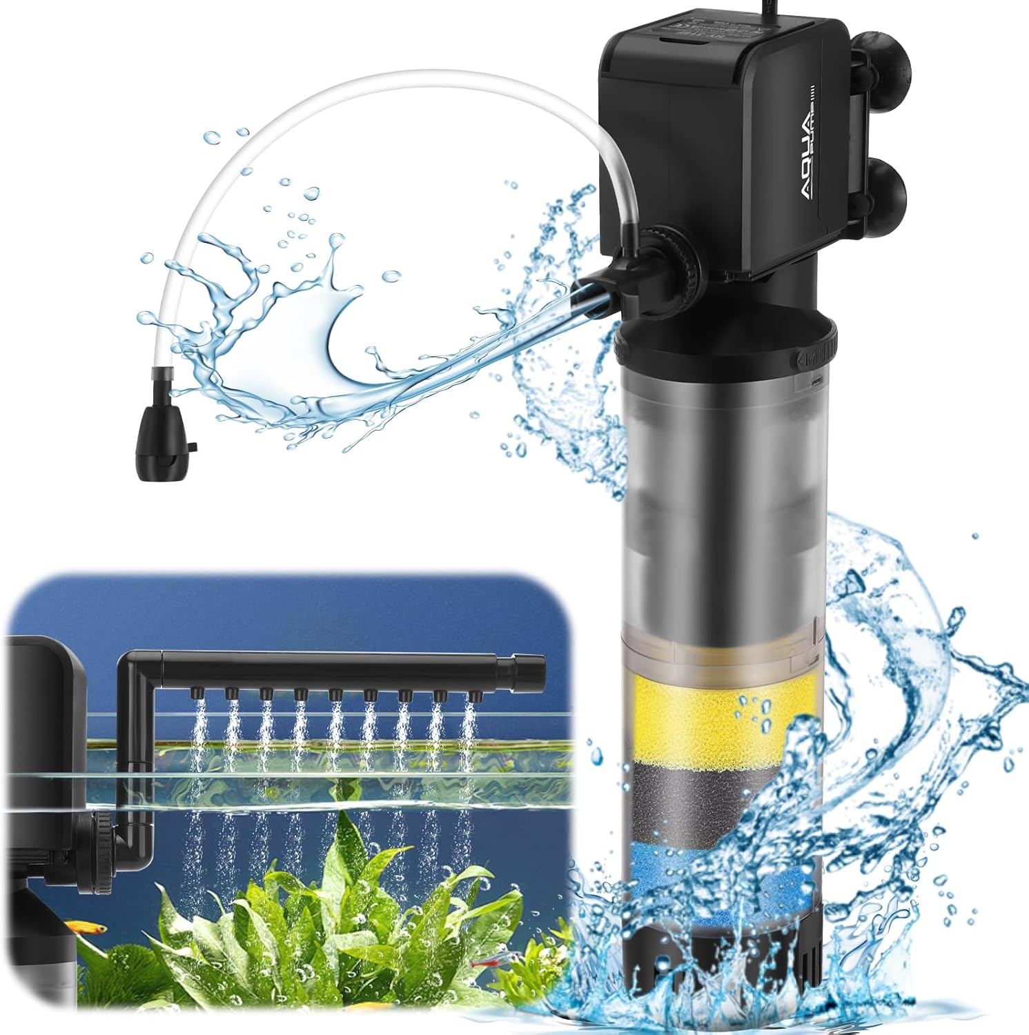 3 IN 1 FISH TANK FILTER: The fish tank filter is a multifunctional underwater filter that integrates circulating filtration, rain spraying and oxygenation, with 3 kinds of water outlet nozzles, 1 filter pump and 1 aerator air tube, enable to generate abundant oxygen and water flow, optimal for oxygen supplement, filtration and water circulation of aquarium.
