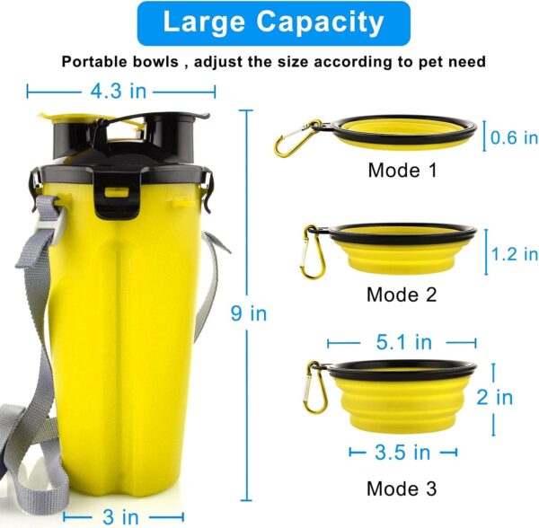 2 Collapsible Bowls: The pet water food bottle with 2 collapsible dog bowls,and a hook on the bottle for us to hang the folding bowl.Cup size: 23*10cm; Folding bowl: 5.5*13cm. Capacity: 250ml for food and 350ml for water in one bottle, the collapsible dog bowl is 350ml.