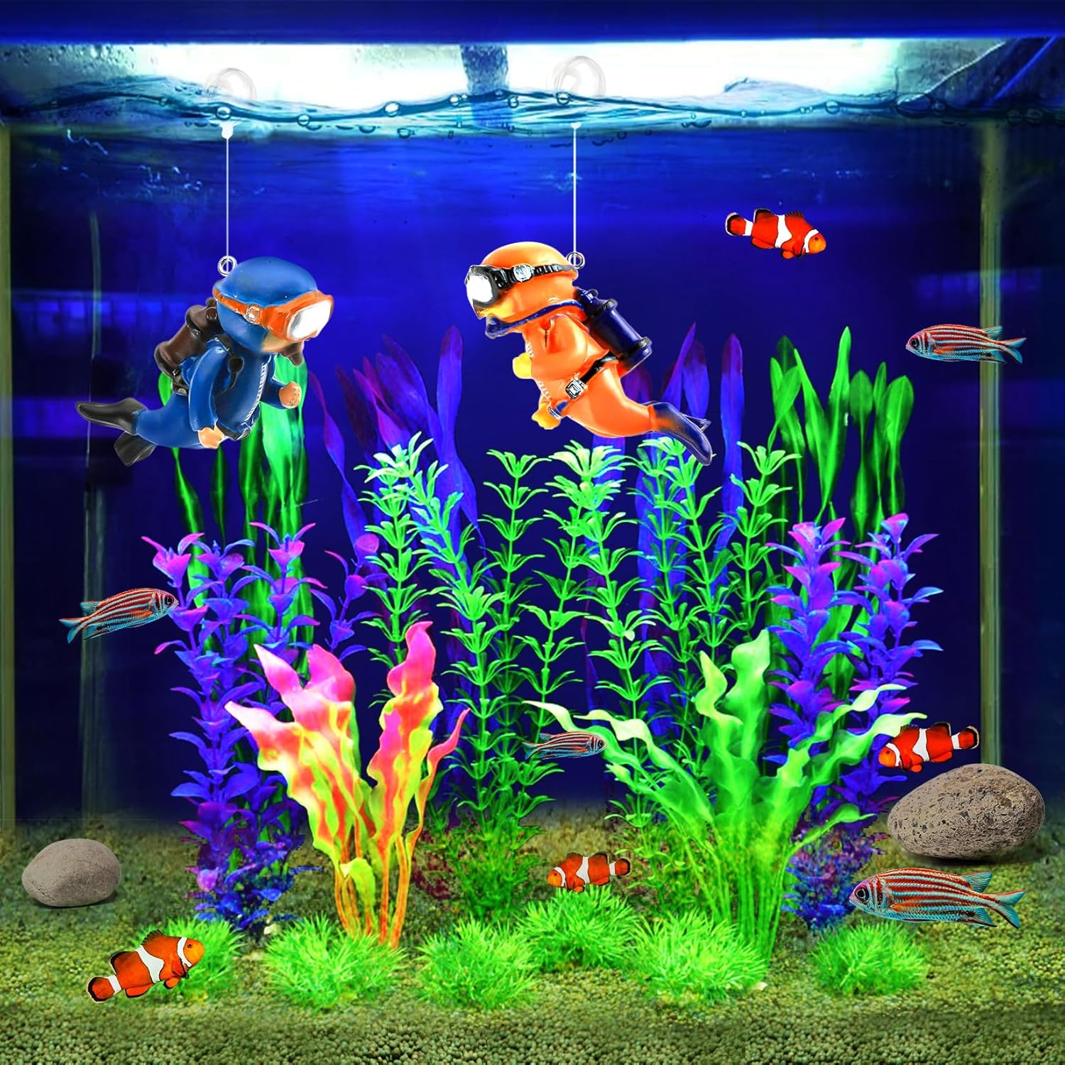 AQUARIUM DÉCOR: The 2 resin divers will not fade or affect the water quality, they have smooth edges so they are very safe for your fish. There is an air float above the divers, adjust the position of the divers in the water by adjusting the length of the rope.