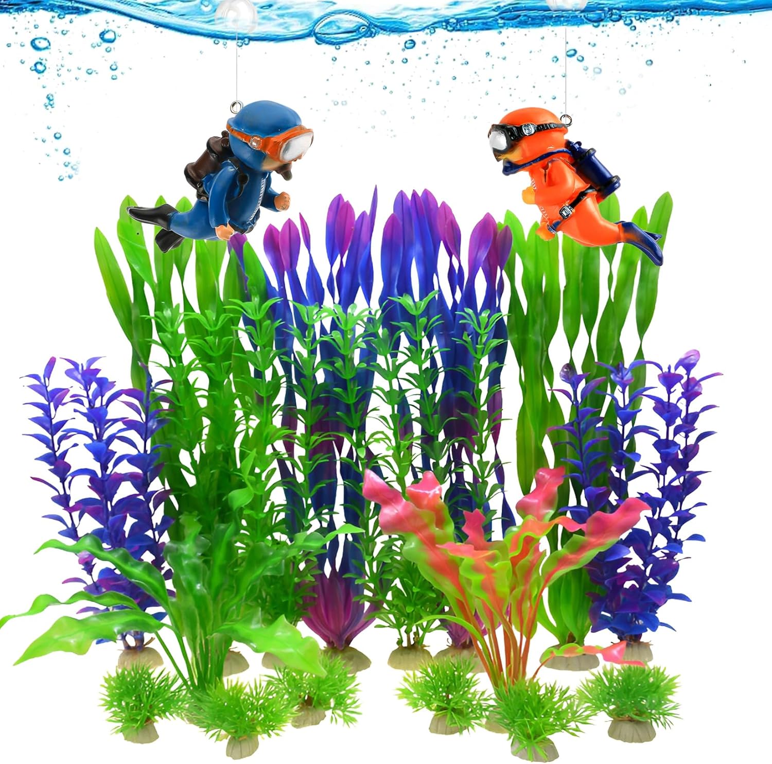 PACKAGE INCLUDES: 16 plastic aquarium plants of varying heights and 2 fun divers. These aquarium plants blend in perfectly with most aquarium landscapes and are ideal for decorating small or large aquariums.