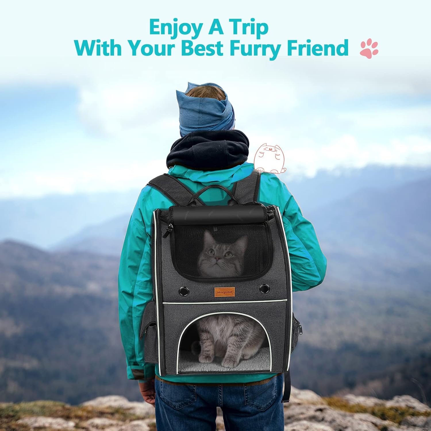 ?️?【Sturdy, Spacious Cat Carrier】 Our premium large cat carrier is thoughtfully designed with an industry-leading 4.0mm hard frame structure that ensures the pet backpack retains its shape, even during extended use. The extendable section features a robust rebound metal frame, offering break-resistant durability. Inside, your pets will enjoy a comfortable environment thanks to the double-sided mat, crafted with sturdy short plush and rattan floor inserts. ?
