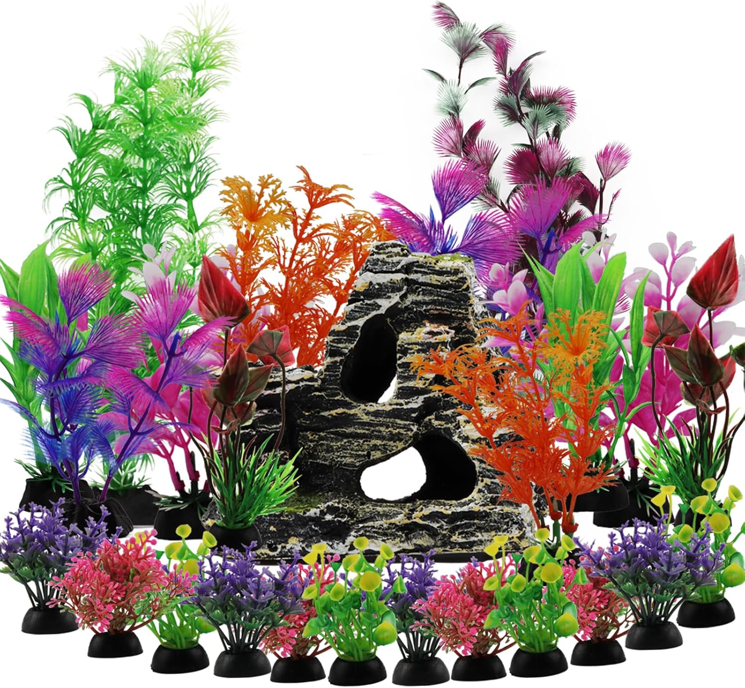Fish Tank Accessories: 1 pieces Resin rockery aquarium decorations with holes and 24 Pieces aquarium plants: (2 – 4.9 inch and 2 large plant: 8.5inch – 12inch, including green, pink, purple, red and orange)