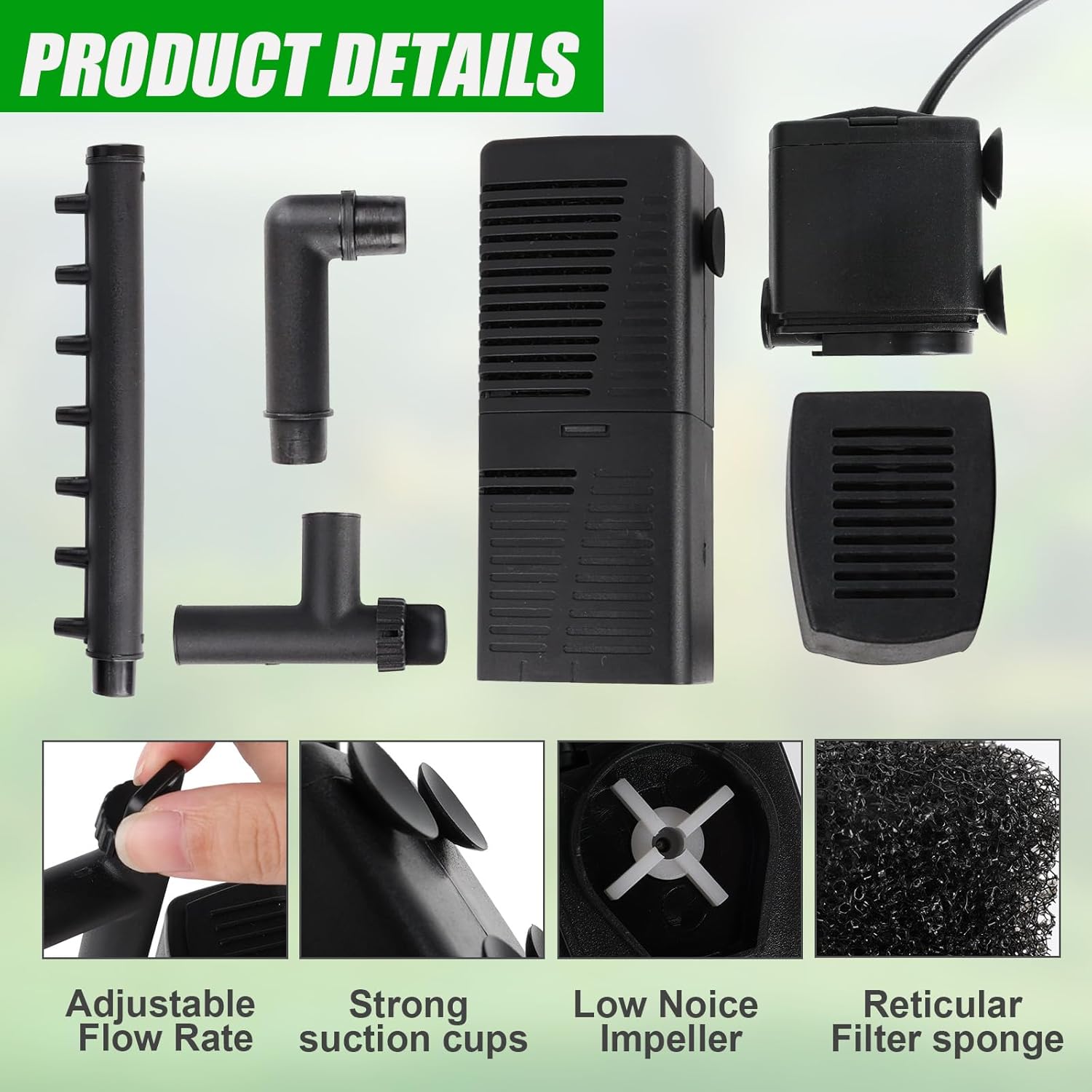 Ultra-Quiet Operation:The fish tank filter operates silently to give your bedroom a quiet environment. 4 sturdy suction cups can be mounted vertically and horizontally on glass surfaces.