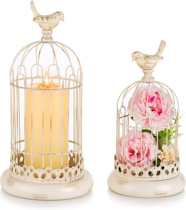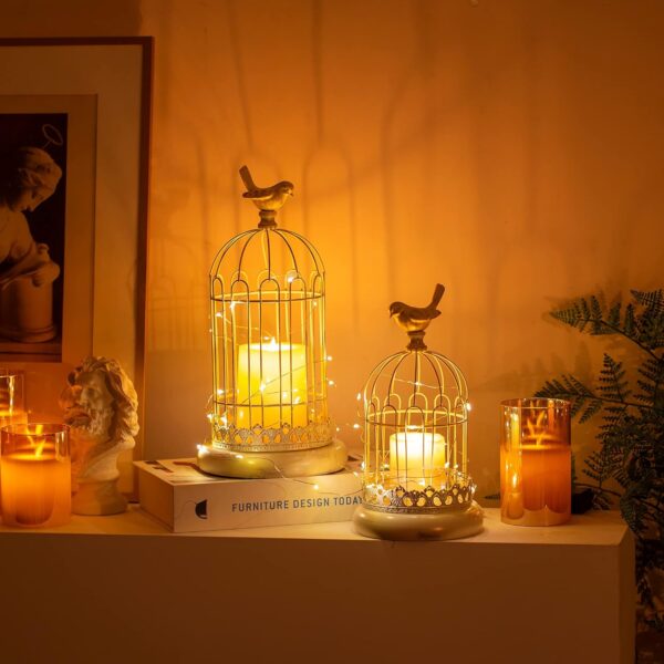 VINTAGE DESIGNE: Rustic distressed matte finish, classic metal wire cage shape and a little bird standing on the top make these cage candle holders an eye-catching decoration to any space.